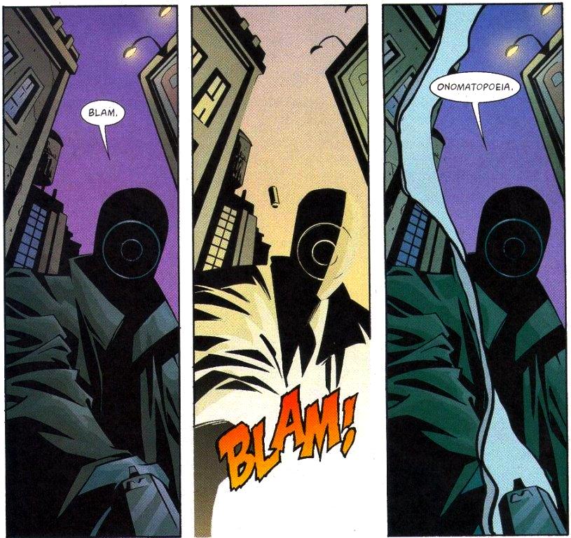 "Blam" is used to convey the sound of gunfire and is implemented with the image of a character shooting a gun.